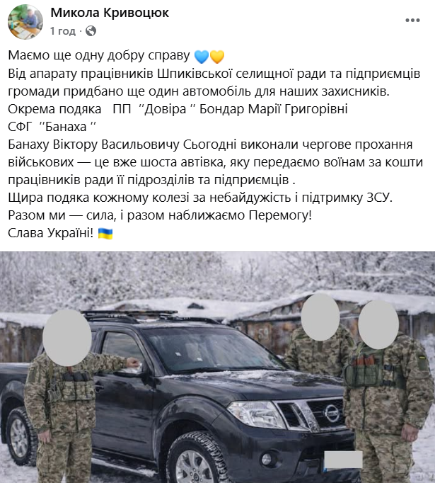 У Шпиківській територіальній громаді продовжують підтримувати українських захисників. За кошти апарату працівників селищної ради та місцевих підприємців придбали ще один автомобіль для потреб військових.
