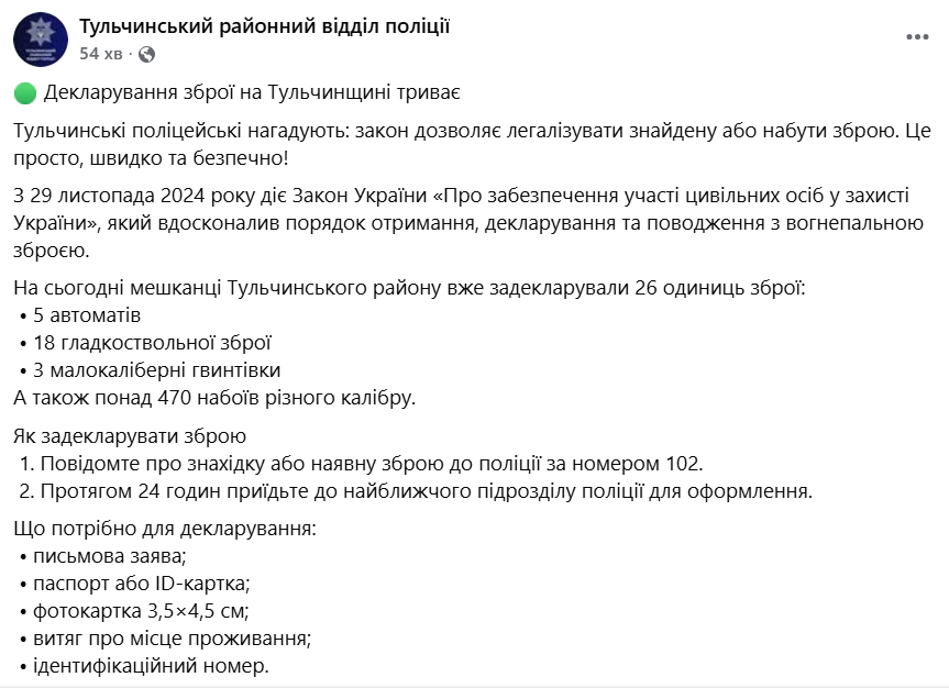 У поліції нагадують, що з 29 листопада 2024 року діє Закон України «Про забезпечення участі цивільних осіб у захисті України», який визначає порядок отримання, декларування та поводження з вогнепальною зброєю.