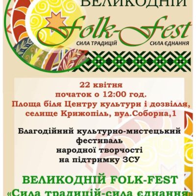 У вівторок, 22 квітня, на центральній площі селища Крижопіль біля Центру культури і дозвілля відбудеться Великодній FOLK-FEST під назвою “Сила традицій — сила єднання”. Початок заходу — о 12:00. Про це повідомляє на сторінці Культура Крижопілля. Фестиваль має благодійний характер: усі зібрані кошти будуть передані на підтримку Збройних Сил України. Захід поєднує святкову атмосферу, культурну […]