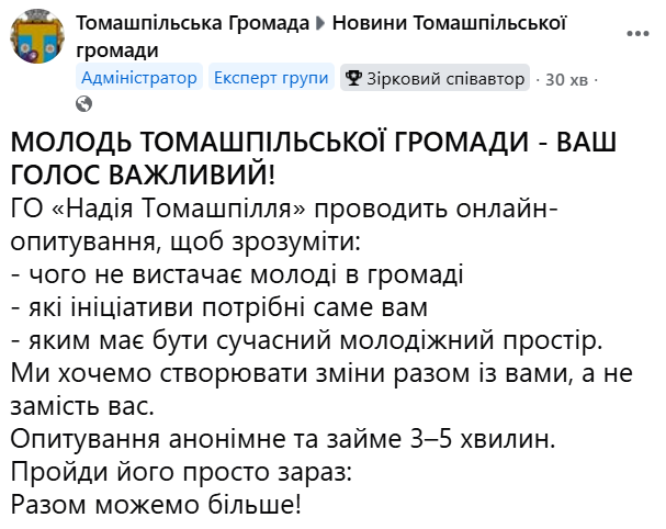 Громадська організація «Надія Томашпілля» оголосила про початок онлайн-опитування серед молоді Томашпільської громади. Ініціатива покликана з’ясувати потреби, очікування та бачення розвитку молодіжного середовища.