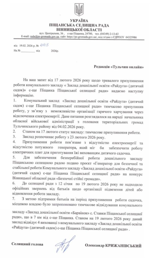 У відповіді додають, що на час призупинення роботи «Райдуги» батькам запропонували альтернативу — тимчасове відвідування комунального закладу «Заклад дошкільної освіти «Барвінок» у селі Ставки, що розташований за 7 кілометрів від Піщанки. Станом на 19 лютого цей заклад відвідують четверо вихованців із «Райдуги».