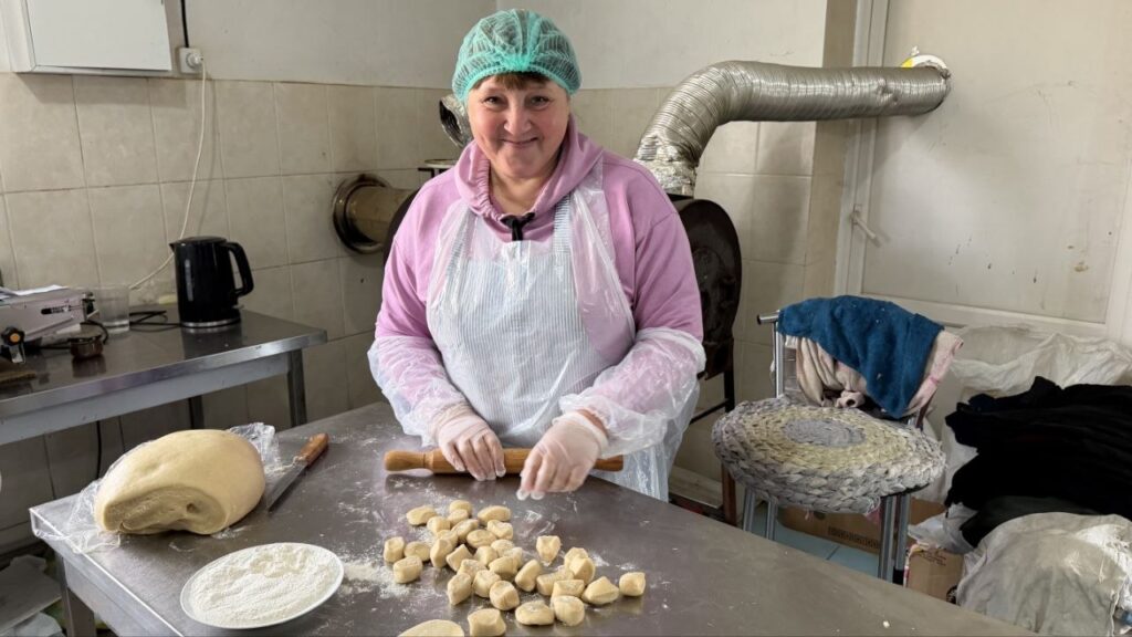Тут готують вареники, супи та борщі, сушать овочі й формують продуктові набори для фронту. За час роботи волонтери передали захисникам понад два мільйони порцій їжі. Окрім цього, у центрі плетуть маскувальні сітки та шиють адаптивний одяг для поранених військових. Частину навичок учасниці опановували вже в процесі роботи.