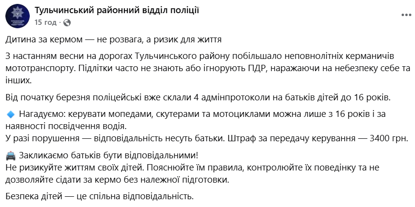 У поліції нагадують, що керувати мототранспортом дозволено лише з 16 років і за наявності посвідчення водія. У разі порушення відповідальність несуть батьки, а штраф за передачу керування становить 3400 гривень.