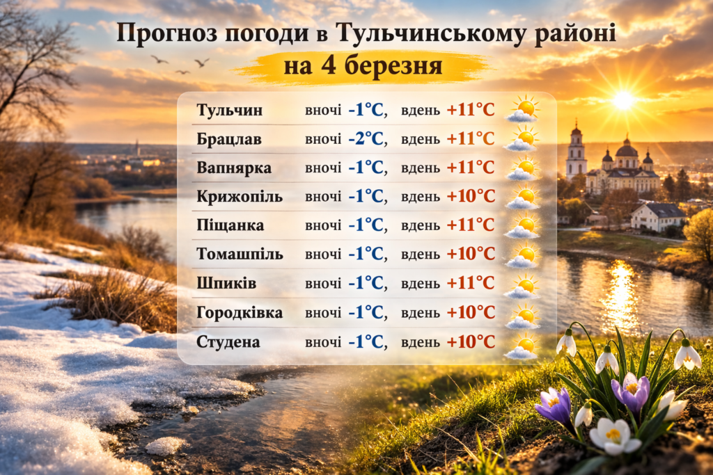 У суботу, 14 лютого, у Тульчинському районі очікується хмарна погода з проясненнями без опадів. Температура вдень підніметься до +10…+11°С.