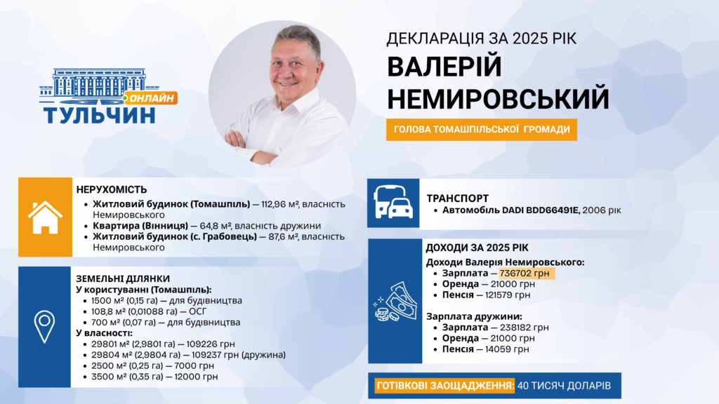Селищний голова Томашпільської громади Валерій Немировський подав декларацію за 2025 рік у березні 2026-го. У документі — житлова нерухомість, земельні ділянки, автомобіль, доходи та готівкові заощадження.