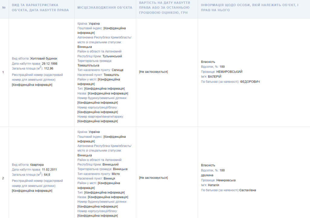 Також задекларовано квартиру у Вінниці площею 64,8 м², набута у 2011 році. Вона належить дружині Наталії Немировській.