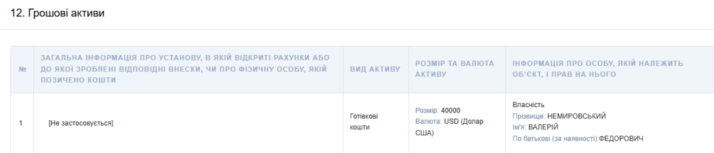 Грошові активи задекларовано у вигляді готівки — 40 000 доларів США, що належать Валерію Немировському.