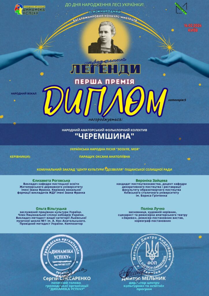 Народний аматорський фольклорний колектив «Черемшина» з Піщанської громади виборов І премію на ІІ Міжнародному багатожанровому конкурсі мистецтв «Народження легенди». Колектив представив українську народну пісню «Зозуле, моя».