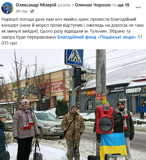 Цього разу колектив завітав до Тульчина, де виступив із благодійною програмою. Під час заходу вдалося зібрати 11 035 гривень. Усі кошти буде перераховано до Благодійного фонду «Піщанські люди».