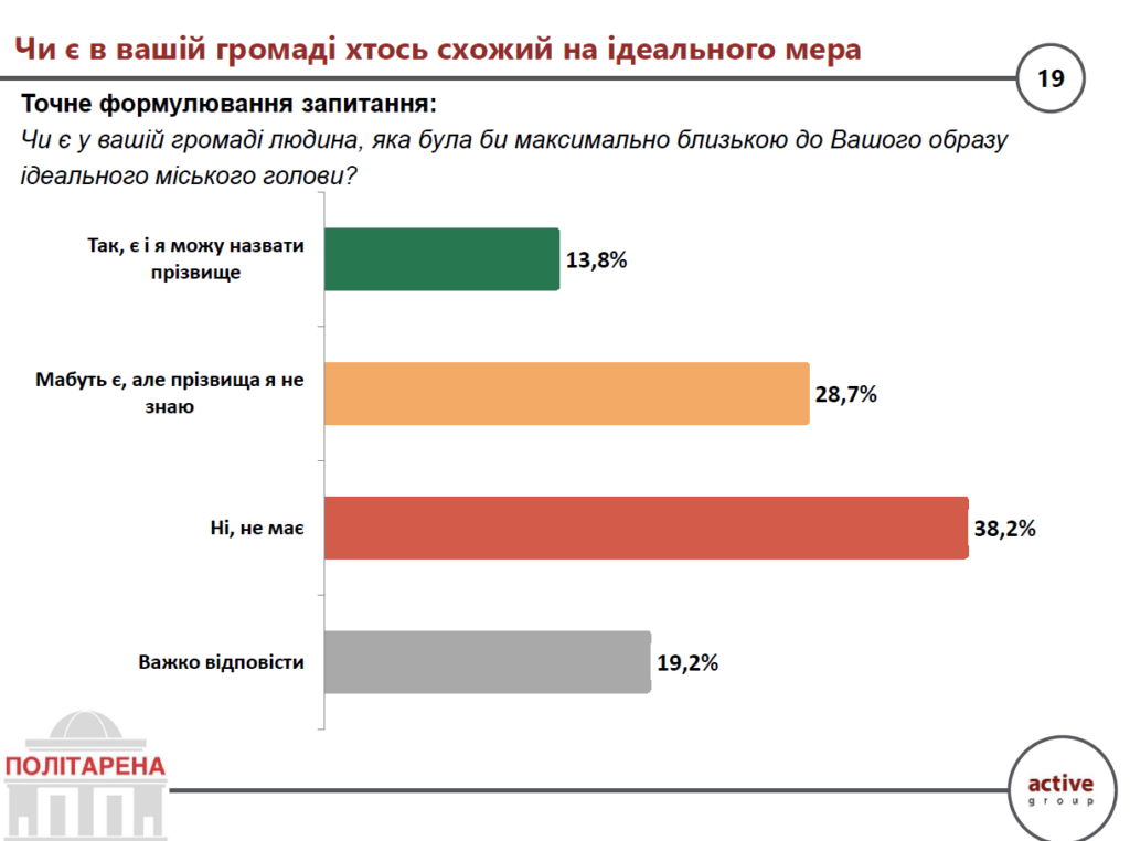 Значна частина опитаних не бачить у своїй громаді людини, яка відповідала б образу ідеального мера. 38,2% переконані, що такого кандидата немає, ще 19,2% не змогли відповісти.
