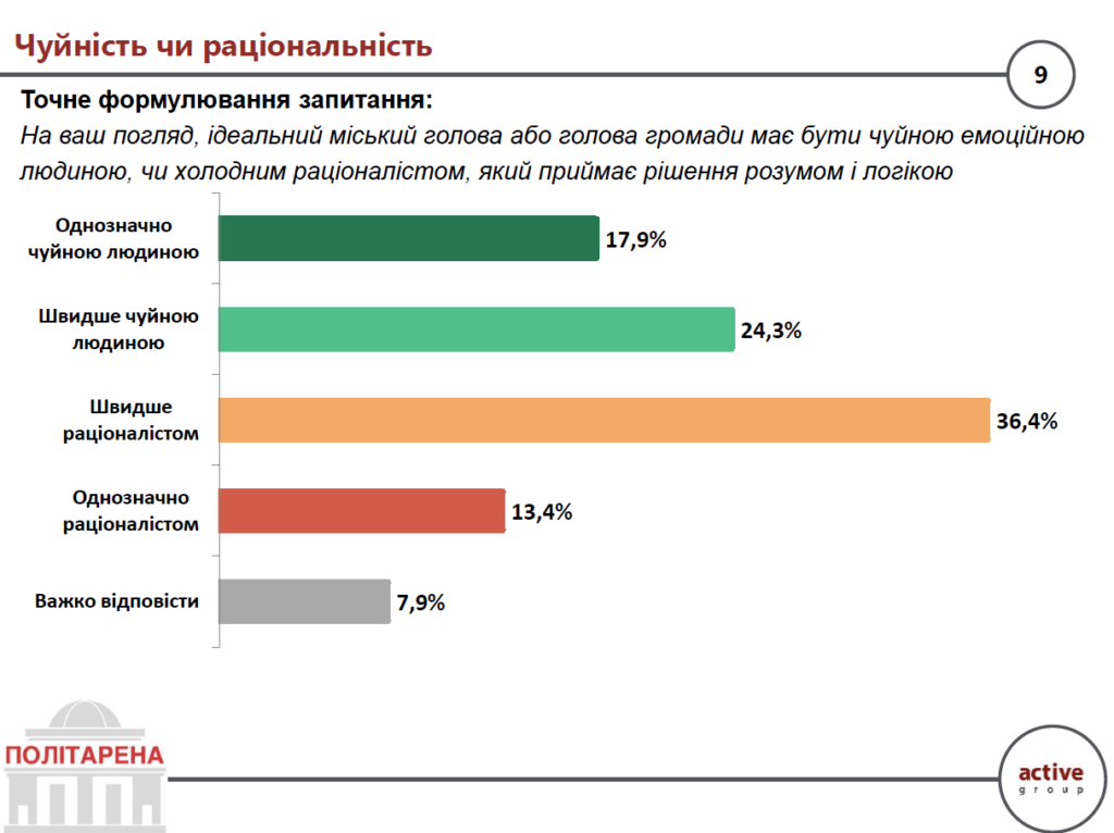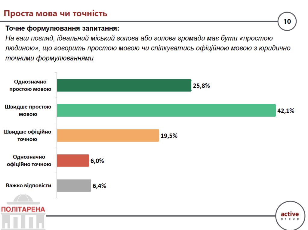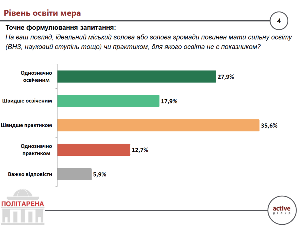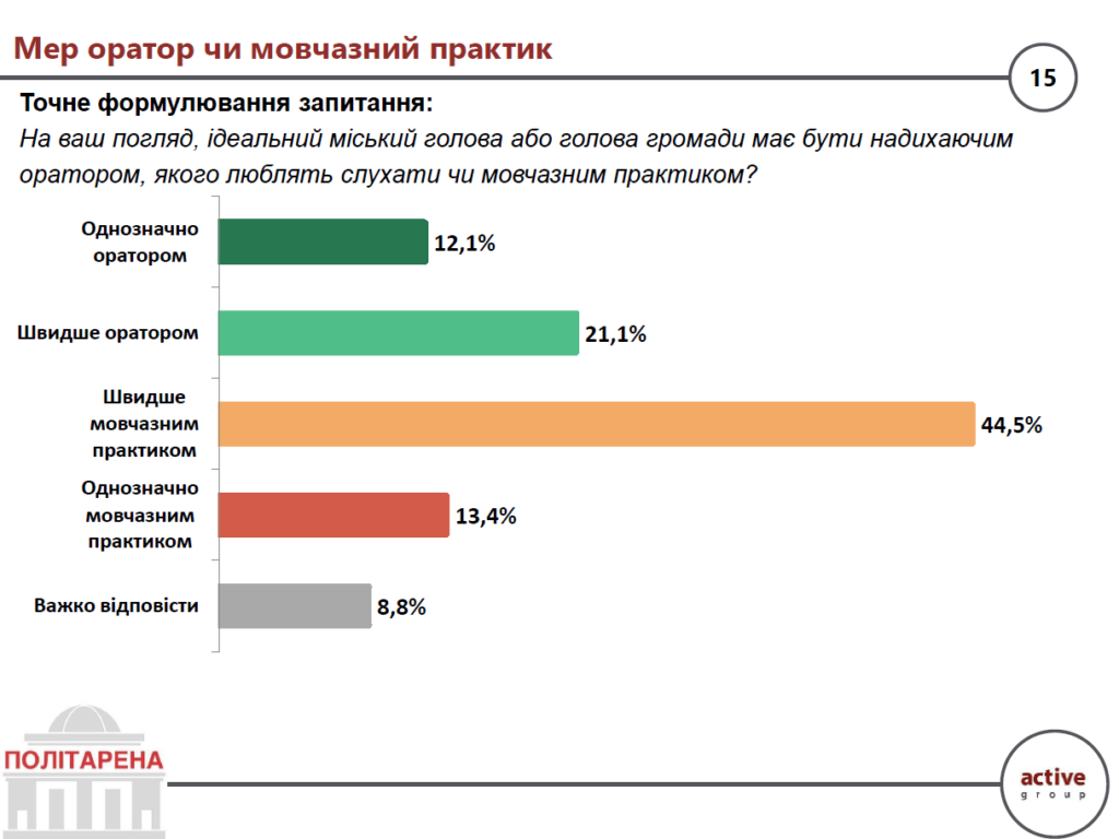 При цьому в образі ідеального мера переважає практичність над красномовством: 57,9% обрали варіант «мовчазний практик», а 33,2% — «надихаючий оратор».