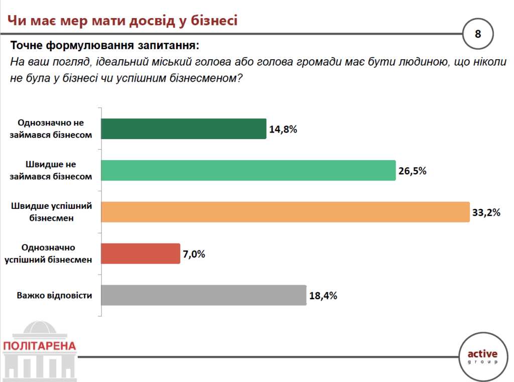 Погляди розділилися і щодо бізнес-досвіду. Приблизно 40,2% хотіли б бачити мером успішного підприємця, тоді як 41,3% переконані, що керівник громади не повинен бути пов’язаний із бізнесом. Ще 18,4% не визначилися.