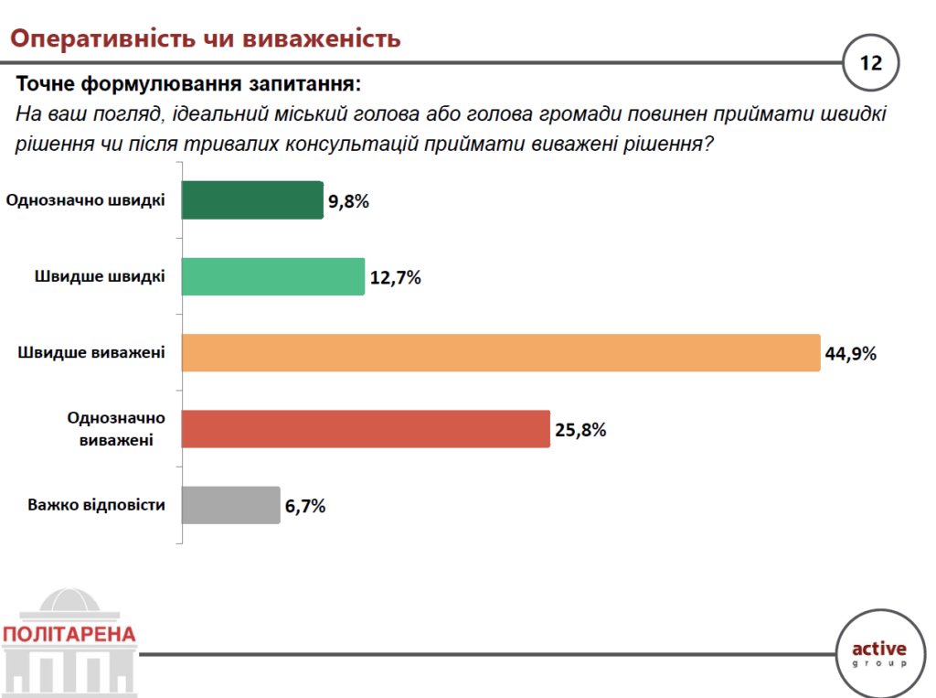 70,7% респондентів вважають, що міський голова має ухвалювати рішення після консультацій і обговорень. Швидкі рішення без тривалого аналізу підтримали 22,5%.