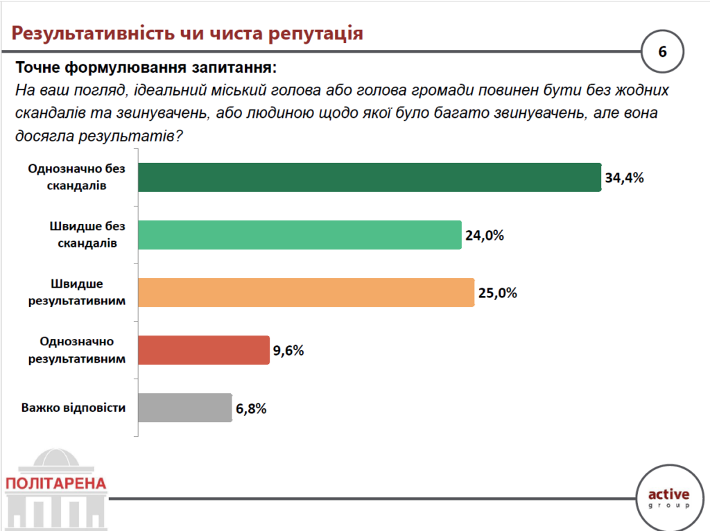 Найбільш одностайні відповіді стосувалися репутації. Понад половина опитаних (58,4%) вважають, що міський голова має бути без скандалів і підозр. Обрати результативного, але скандального керівника готові 34,6% респондентів.