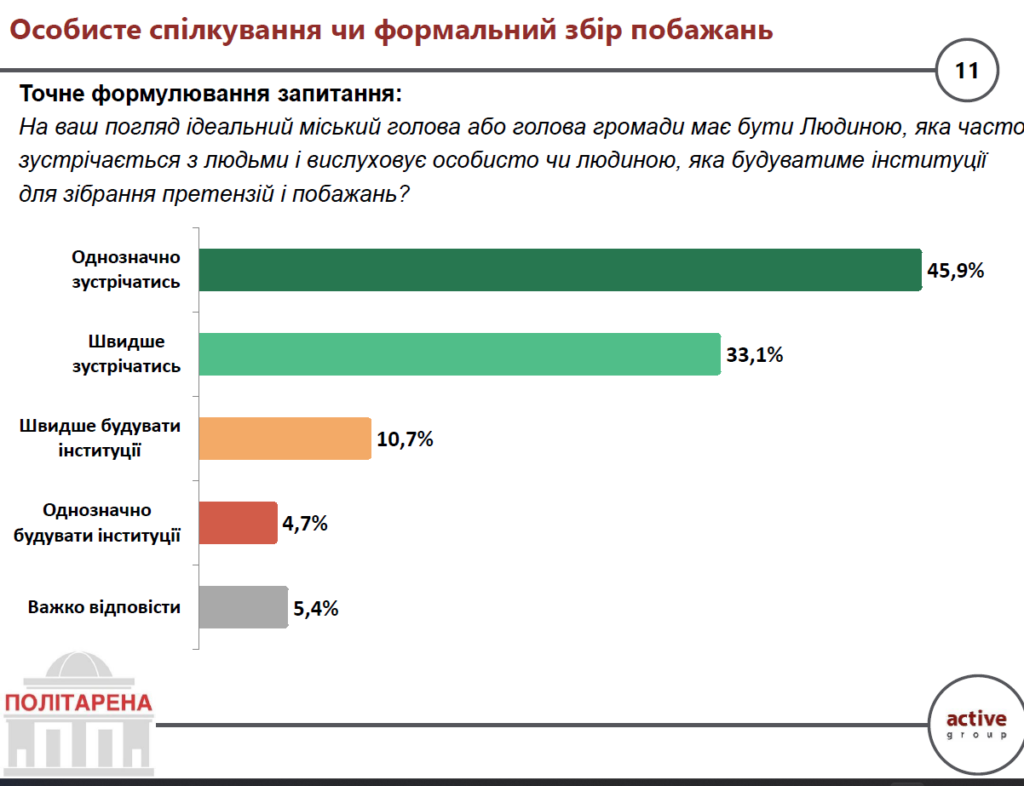 Видання «Політарена» спільно з дослідницькою компанією Active Group провели опитування, щоб з’ясувати, яким українці бачать керівника громади. За результатами дослідження, ідеальний міський голова має поєднувати відкритість до людей, здатність до компромісу та публічність із бездоганною репутацією і зосередженістю на потребах громади.