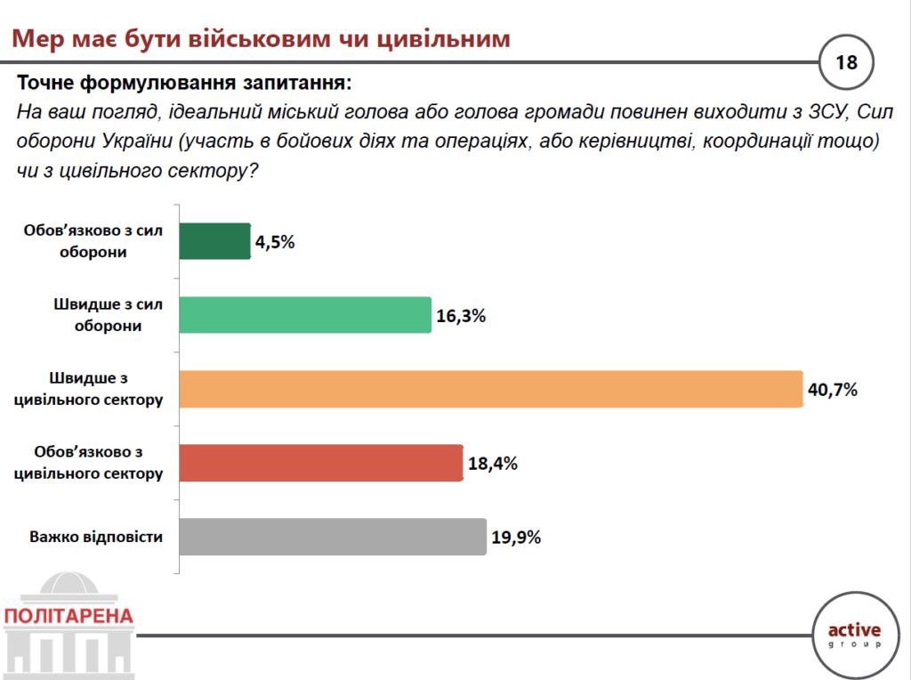 Більшість опитаних хотіли б бачити мером представника цивільного сектору. Підтримку кандидатур із військовим досвідом висловили 20,8% респондентів, ще 19,9% не змогли визначитися з відповіддю.