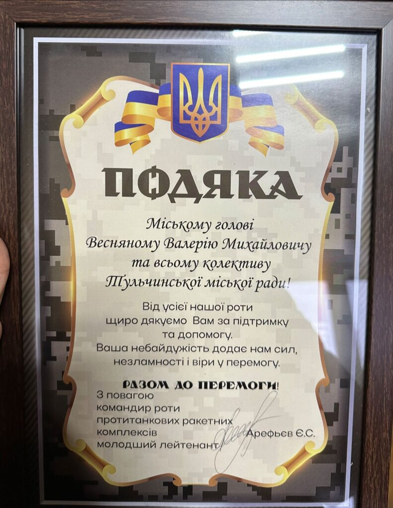 Колектив Тульчинської міської ради отримав подяку від військовослужбовців окремого штурмового полку за переданий інверторний бензиновий генератор.
