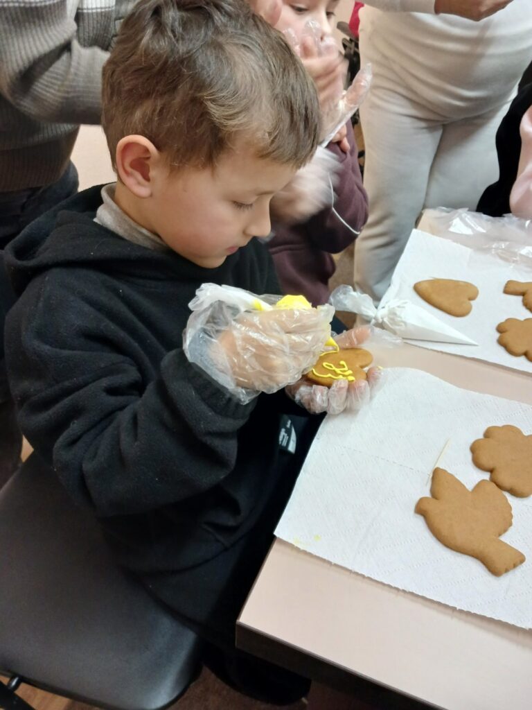 Майстриня Ольга Латкун познайомила дітей з історією появи імбирного печива, традиціями його поширення в Україні та поділилася рецептом пряників і секретами приготування ідеальної глазурі. Після короткого вступу діти разом із дорослими захоплено поринули у творчий процес: хтось довго обирав візерунок, хтось — колір глазурі, а дехто не втримався й одразу куштував запашну випічку.