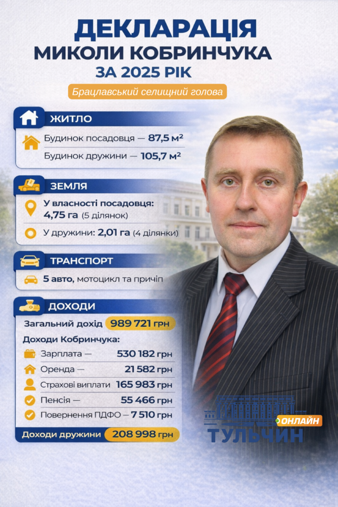 Голова Брацлавської громади Микола Кобринчук подав декларацію за 2025 рік. У документі згадано житлові будинки, земельні ділянки, транспорт та доходи посадовця, а також його дружини.
