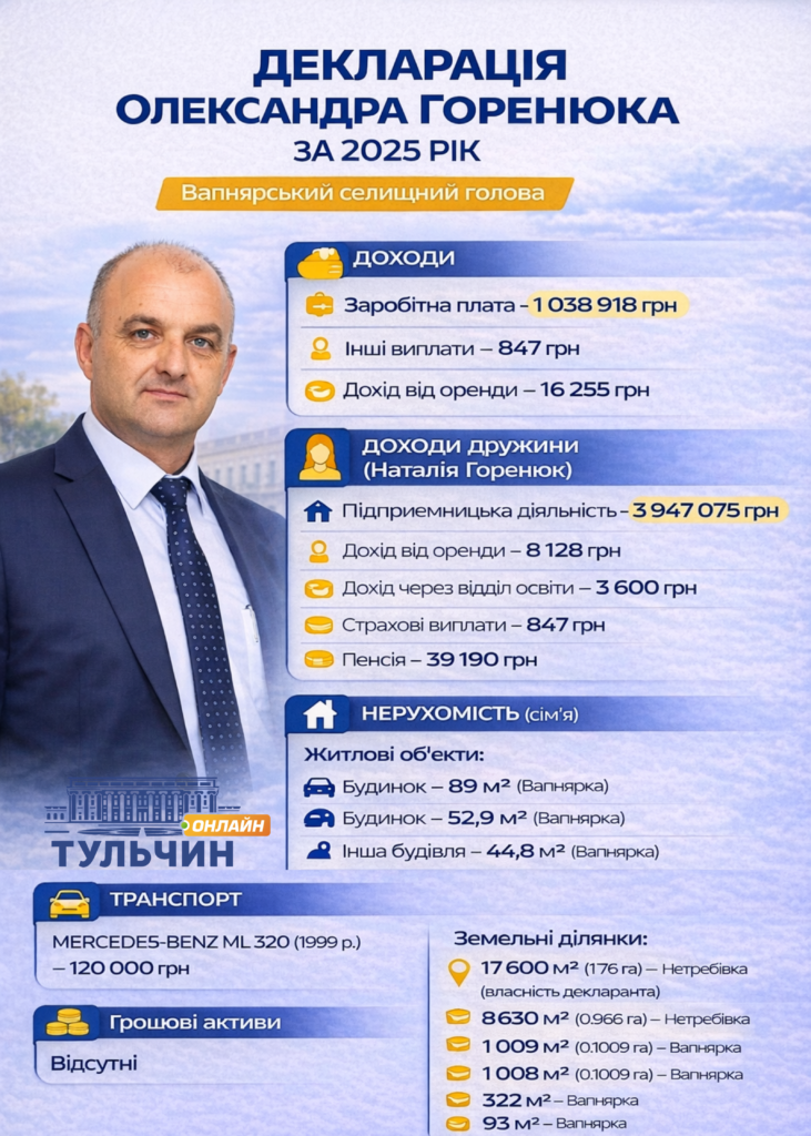 Селищний голова Вапнярської громади Олександр Горенюк подав декларацію за 2025 рік у березні 2026-го. У документі вказано зарплату понад мільйон гривень, земельні ділянки у Вапнярці та Нетребівці, а також значні доходи його дружини від підприємницької діяльності. Водночас майже всі землі та майно також оформлені на дружину.