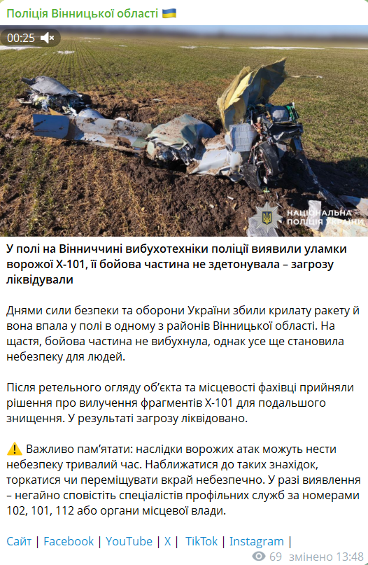 “На щастя, бойова частина не вибухнула, однак усе ще становила небезпеку для людей. Після ретельного огляду об’єкта та місцевості фахівці прийняли рішення про вилучення фрагментів Х-101 для подальшого знищення. У результаті загрозу ліквідовано”, — зазначили у поліції.