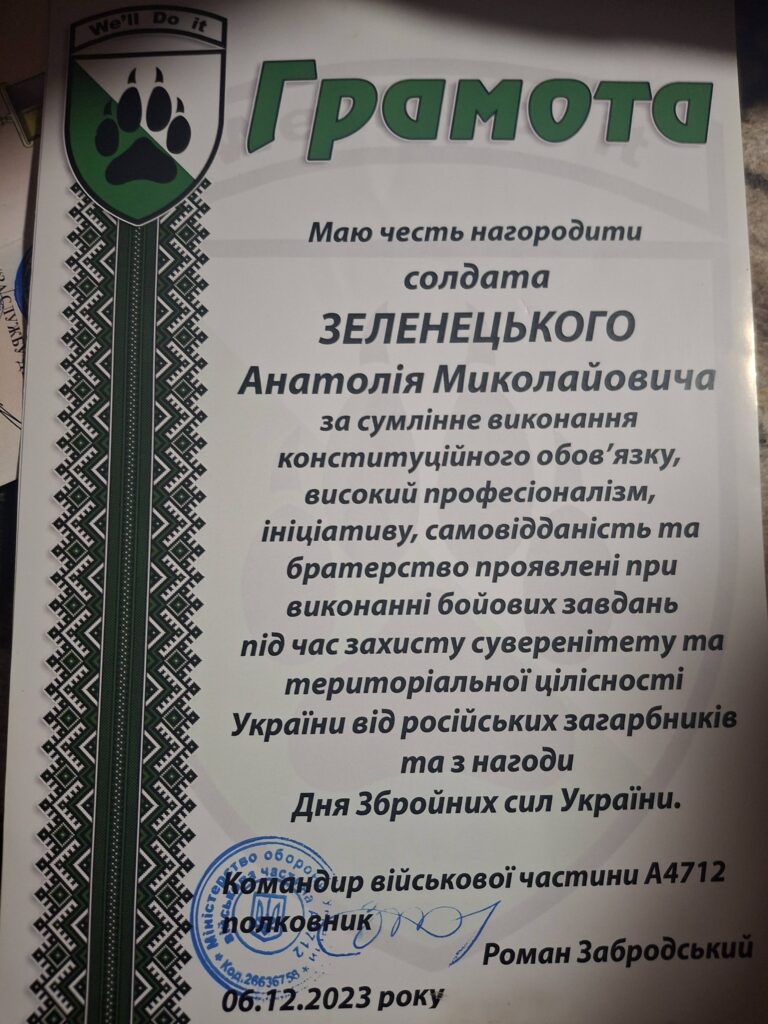 Старшого солдата Анатолія Зеленецького нагороджено за сумлінне виконання конституційного обов’язку, високий професіоналізм, ініціативу, самовідданість і братерство, проявлені під час виконання бойових завдань із захисту суверенітету та територіальної цілісності України.