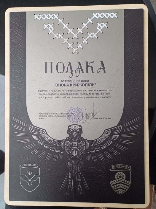 Роботу фонду високо оцінили на фронті. Волонтери отримали подяку від 59-ї окремої штурмової бригади безпілотних систем імені Якова Гандзюка, зокрема від 1-го батальйону БПС «Хижаки висот».