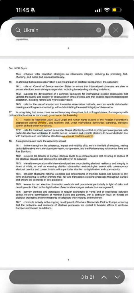 Згідно з пунктом 17.1 резолюції ПАРЄ 2605 (2025), проведення виборів під час війни суперечить основам демократії. Асамблея закликала підтримувати країни, що переживають збройні конфлікти, зокрема Україну, щоб забезпечити безпечні та легітимні вибори після стабілізації ситуації.