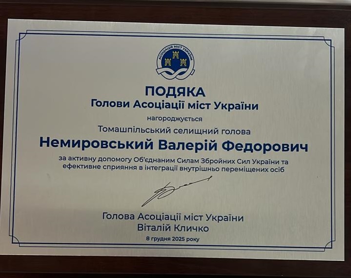 У рамках XIX Українського муніципального форуму у столиці Томашпільський селищний голова Валерій Немировський отримав Подяку Голови Асоціації міст України Віталія Кличка. Відзнаку вручили за активну допомогу Об’єднаним Силам Збройних Сил України та ефективне сприяння інтеграції внутрішньо переміщених осіб. Про це повідомили на сторінці Новини Томашпільської громади.