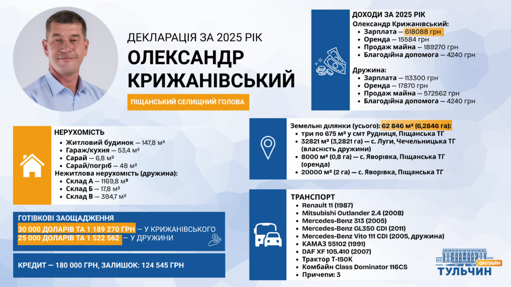 Селищний голова Піщанської громади Олександр Крижанівський подав декларацію за 2025 рік у березні 2026-го. У документі вказані нерухомість у Вінницькій області, транспорт, доходи родини та значні готівкові заощадження.