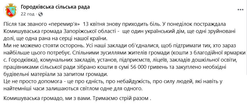 У сільській раді зазначили, що така ініціатива стала прикладом згуртованості та підтримки у складний час. У зверненні також висловили солідарність із мешканцями Комишуваської громади.