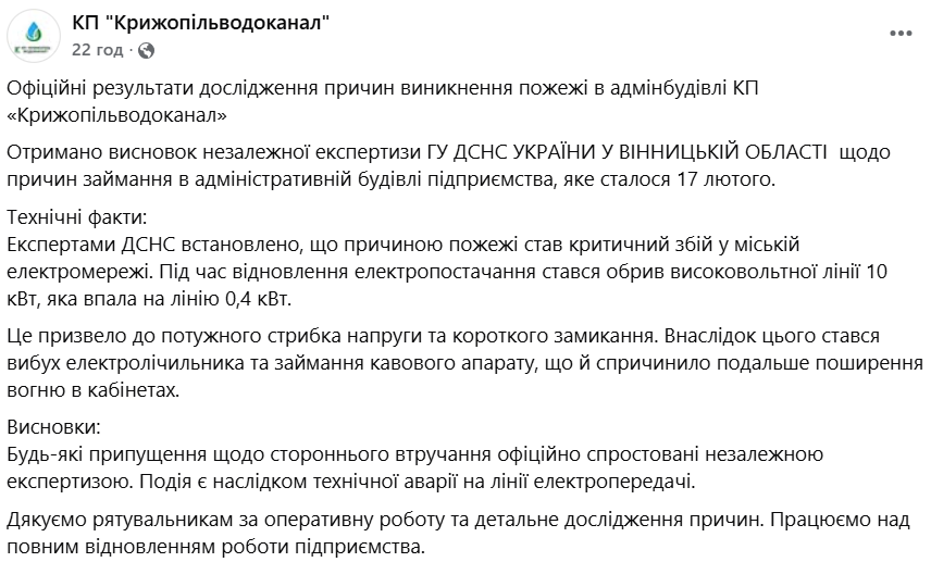 Оприлюднено результати експертного дослідження причин пожежі в адміністративній будівлі КП «Крижопільводоканал», яка сталася 17 лютого. Висновок підготували фахівці Головного управління ДСНС України у Вінницькій області.