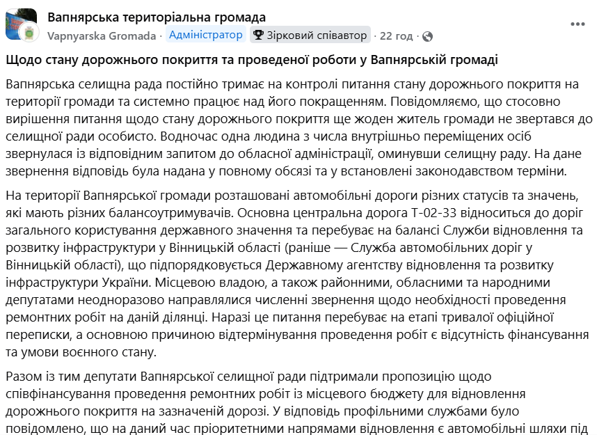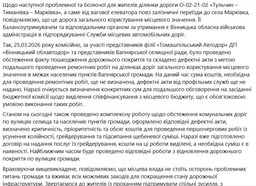 У Вапнярській громаді пояснили ситуацію зі станом доріг і ходом ремонтних робіт. Частина проблемних ділянок залежить не від місцевої влади, а від державних і обласних структур, тому рішення затягуються через фінансування та пріоритети під час воєнного стану.