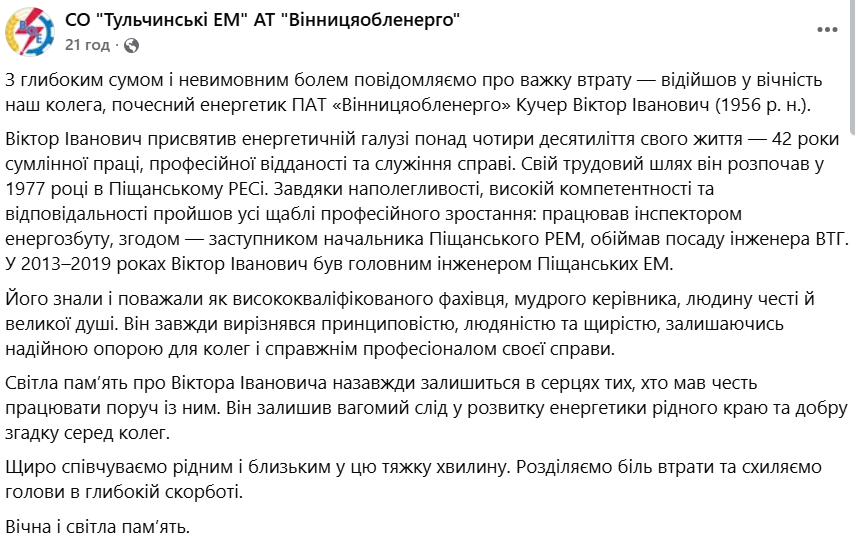 Пішов із життя почесний енергетик ПАТ «Вінницяобленерго» Віктор Кучер. Йому було 69 років. Віктор розпочав свій трудовий шлях у 1977 році.