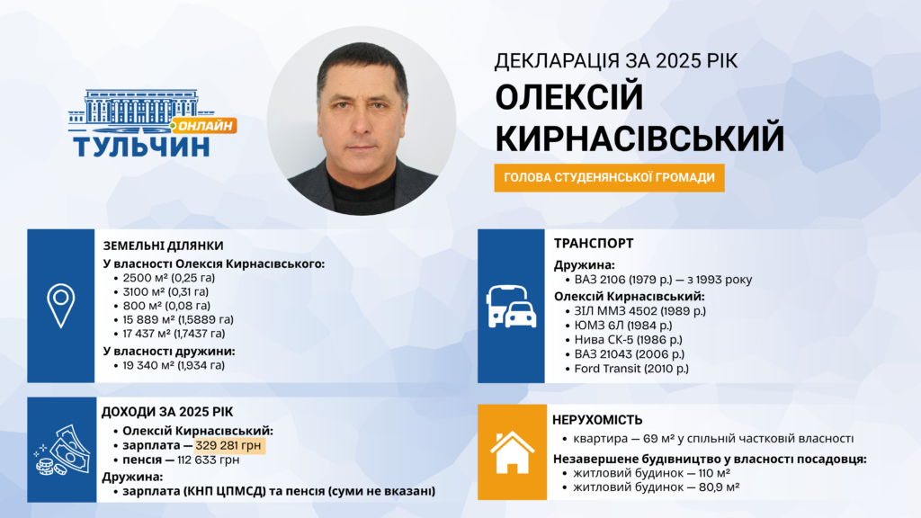 Селищний голова Студенянської громади Олексій Кирнасівський подав декларацію за 2025 рік у березні 2026-го. У документі — квартира, шість земельних ділянок, об’єкти незавершеного будівництва та шість транспортних засобів.