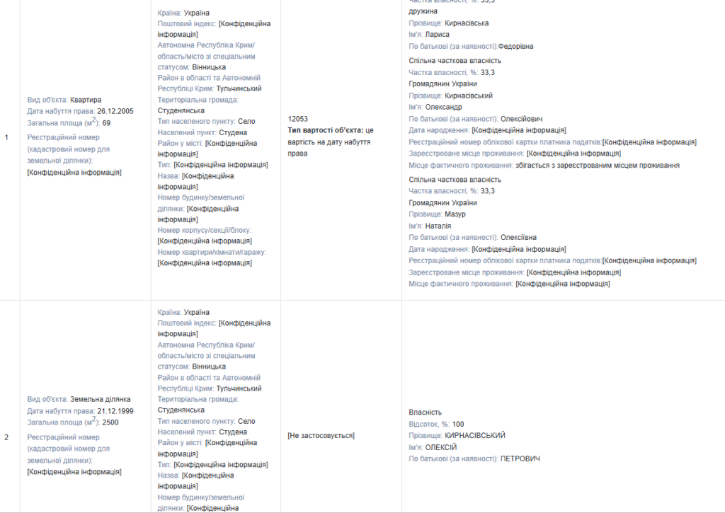 У декларації вказано квартиру площею 69 м², яка була набута 26 грудня 2005 року. Вона перебуває у спільній частковій власності: по 33,3% належить дружині Ларисі Кирнасівській, Олександру Кирнасівському та Наталії Мазур. Вартість на дату набуття права — 12 053 грн.
