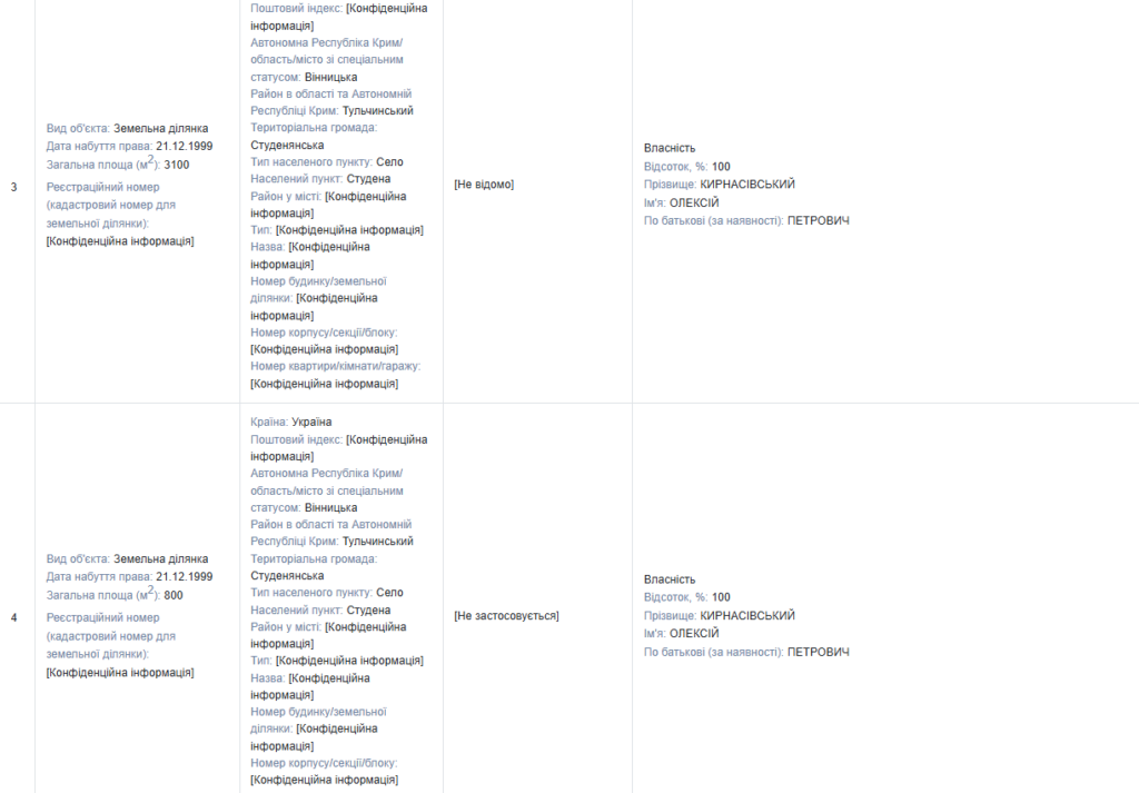 Олексій Кирнасівський задекларував шість земельних ділянок у селі Студена. Три з них мають площу 2500 м² (0,25 га), 3100 м² (0,31 га) та 800 м² (0,08 га) — усі у його приватній власності з 21 грудня 1999 року.