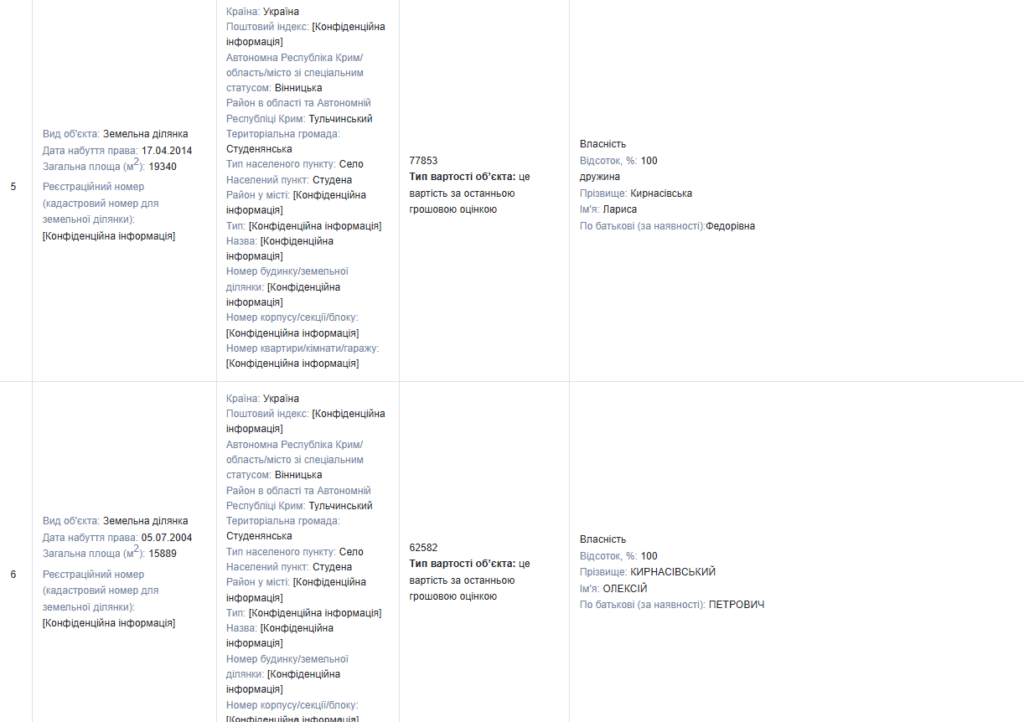 Ще три ділянки більші за площею. Одна — 19 340 м² (1,934 га), набута 17 квітня 2014 року, перебуває у власності дружини. Її вартість за останньою грошовою оцінкою — 77 853 грн. Дві інші належать самому декларанту: 15 889 м² (1,5889 га) вартістю 62 582 грн та 17 437 м² (1,7437 га) вартістю 68 914 грн.