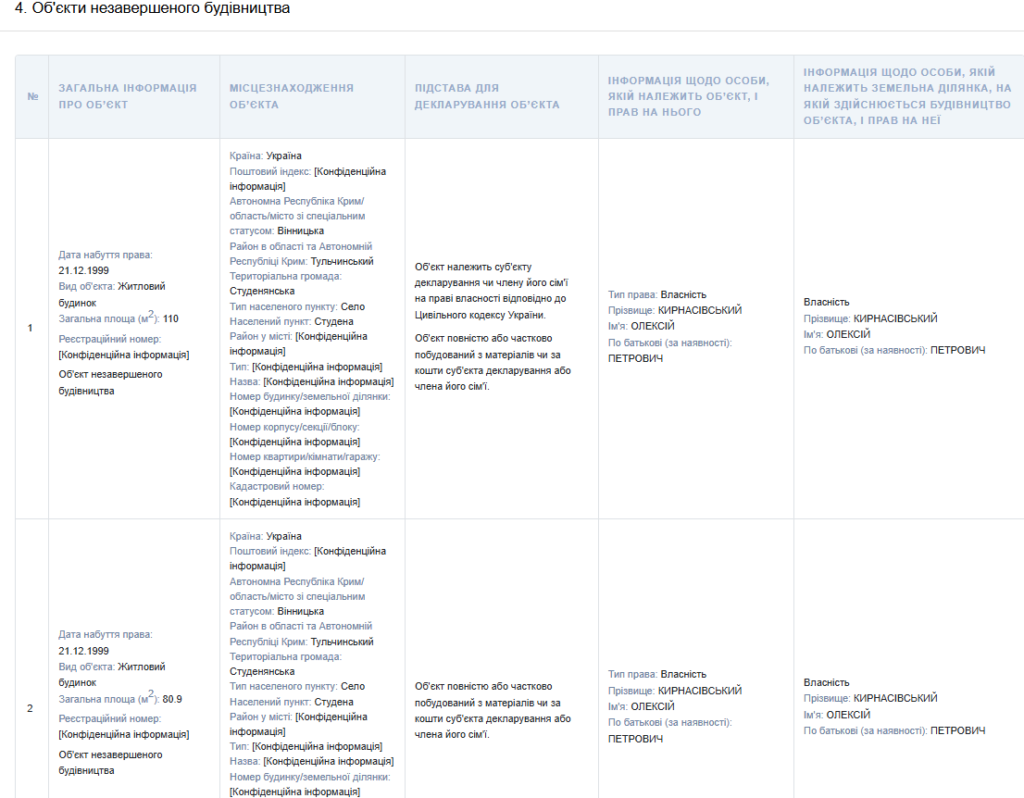 Окремо зазначено два об’єкти незавершеного будівництва — житлові будинки площею 110 м² і 80,9 м². Обидва належать Олексію Кирнасівському. Вони зведені повністю або частково з матеріалів за кошти декларанта чи членів його сім’ї.