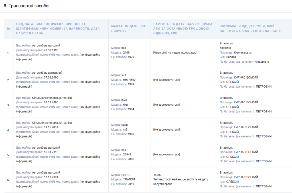 Також у його власності два легкові автомобілі: ВАЗ 21043 2006 року та Ford Transit 2010 року. Останній придбаний у 2024 році.