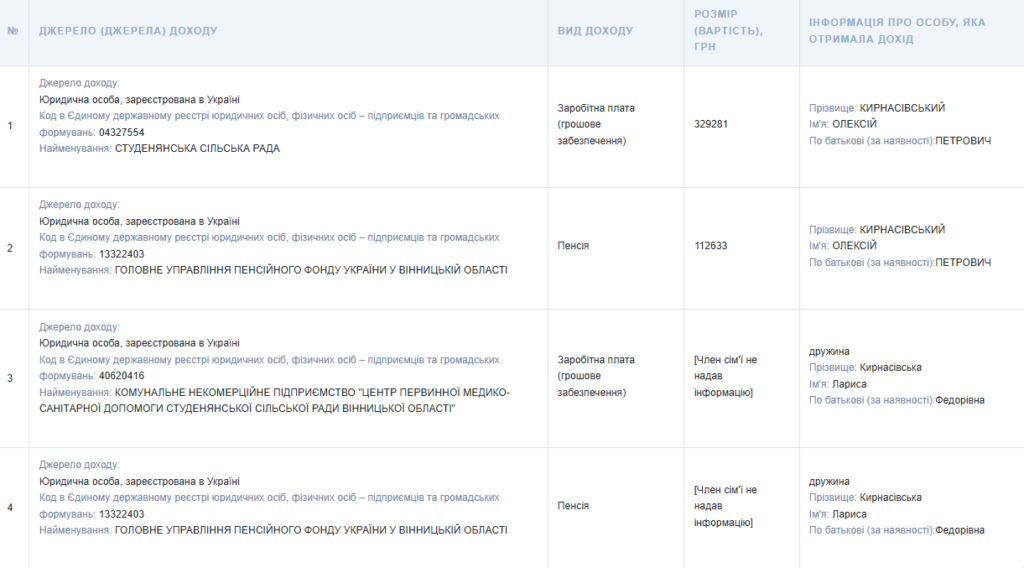 За 2025 рік Олексій Кирнасівський отримав 329 281 грн заробітної плати у Студенянській сільській раді. Крім того, він задекларував 112 633 грн пенсії від Головного управління Пенсійного фонду у Вінницькій області.