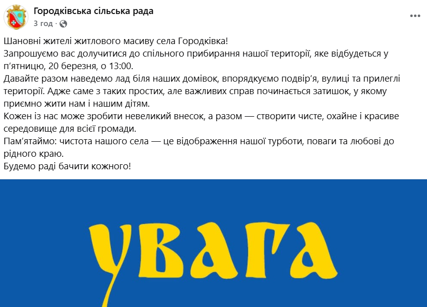 Жителів закликають разом навести лад біля своїх домівок, прибрати прилеглі території та впорядкувати громадський простір. У сільській раді зазначають, що такі ініціативи допомагають підтримувати чистоту і створювати комфортне середовище для життя.
