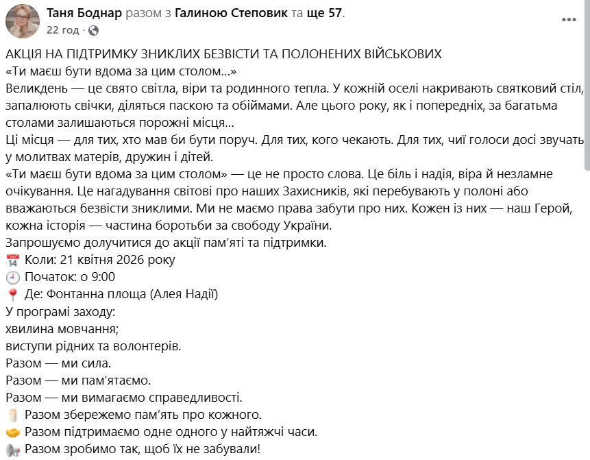 Організатори наголошують: символічні «порожні місця» за великодніми столами мають нагадати про кожного, хто не повернувся додому. Такі заходи — спосіб підтримати родини та зберегти увагу суспільства до теми полонених і зниклих безвісти.