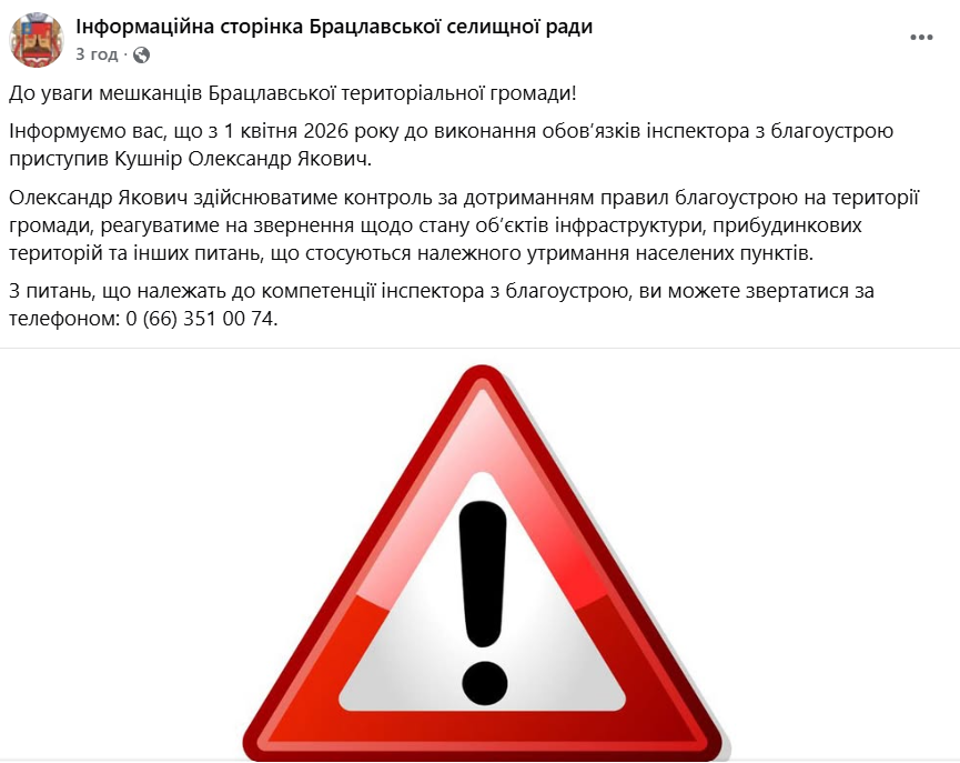 У Брацлавській громаді призначили інспектора з благоустрою. Посадовець уже розпочав виконання обов’язків із 1 квітня.