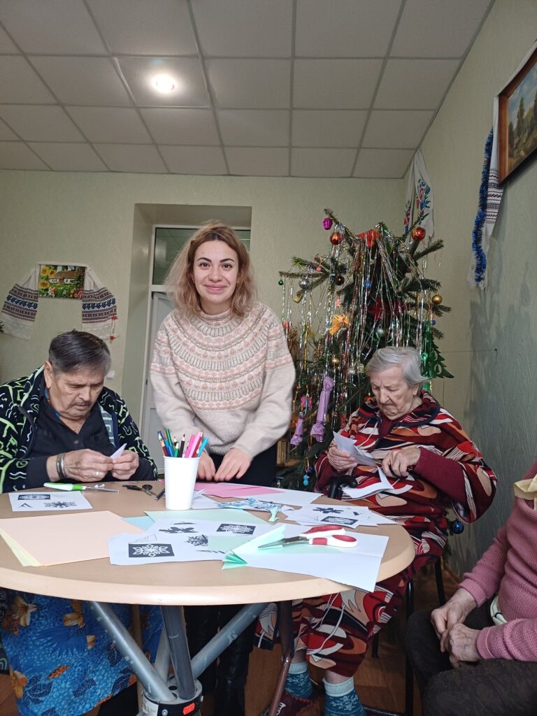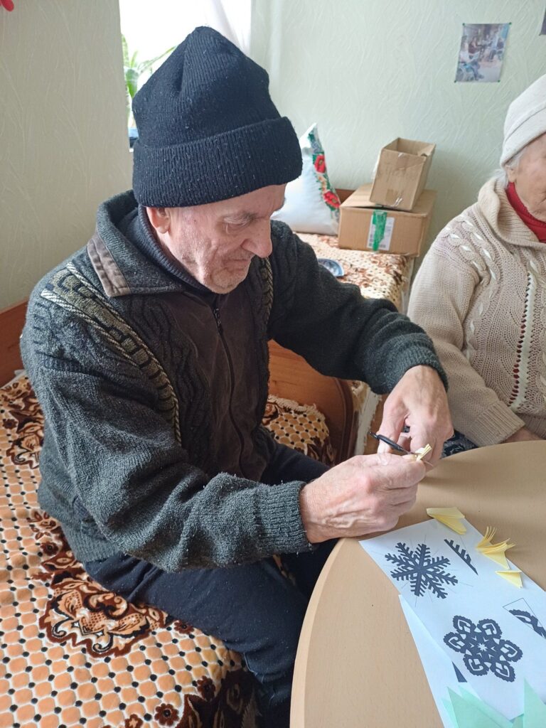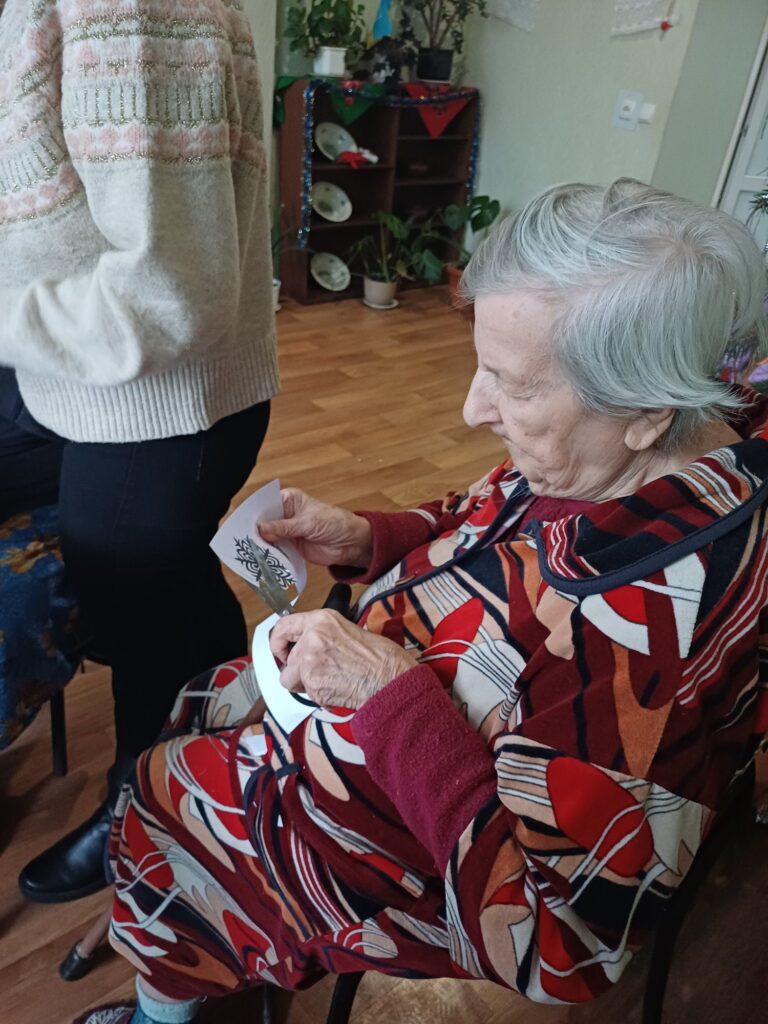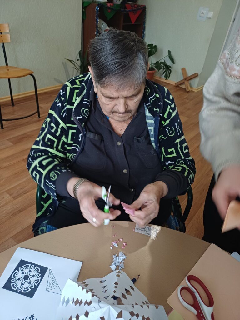 Під час заняття учасники долучилися до творчої діяльності — вирізали новорічні сніжинки, проявляючи фантазію та індивідуальність. Такий формат арт-терапії сприяв розвитку дрібної моторики рук, концентрації уваги та уяви, а також допомагав підопічним відчути радість від власноруч створених робіт і власну значущість.