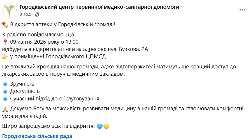 У Городківській громаді 9 квітня запрацює аптека у приміщенні Центру первинної медико-санітарної допомоги. Це має покращити доступ жителів до необхідних ліків.