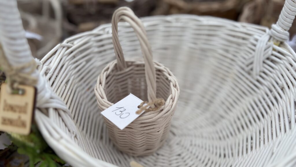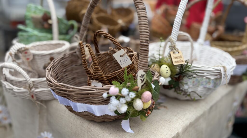Окремий сегмент — вироби ручної роботи: великодні композиції, свічки, кошики з писанками та плетені кошики з паперової лози — від 130 до 700 грн залежно від розміру.