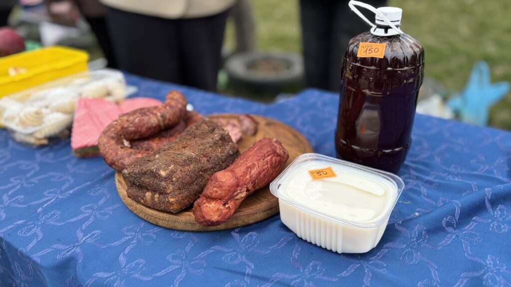 Асортимент — з акцентом на домашнє виробництво. Паски продавали по 100–150 грн, ковбасу — близько 200 грн за кільце. Тушковане м’ясо — приблизно 150 грн за банку, соління — від 30 грн.
