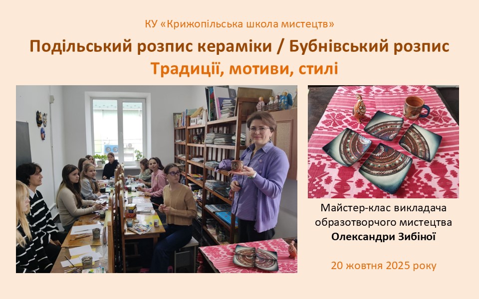 20 жовтня у Крижопільській школі мистецтв відбувся захопливий майстер-клас із бубнівського розпису. Викладачка образотворчого мистецтва Олександра Зибіна познайомила учнів базового рівня з історією та характерними мотивами цього традиційного подільського малярства — багатого на яскраві барви й теплоту народної душі.