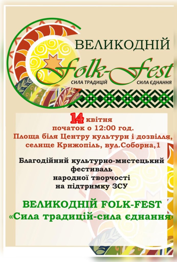 FOLK-FEST відбудеться 14 квітня о 12:00 за адресою: селище Крижопіль, вул. Соборна, 1. Організатори закликають жителів та гостей громади долучатися до події та підтримати військових донатами.